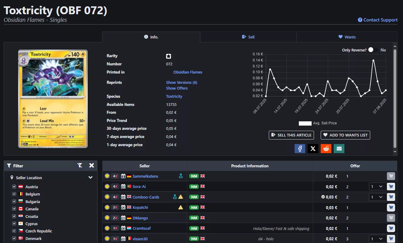 - Ceny: To, co mi się podoba, to fakt, że ceny są zróżnicowane i można znaleźć zarówno karty w idealnym stanie, jak i te z drobnymi wadami, co przekłada się na niższe ceny. Cardmarket pozwala na ustawienie własnych cen, ale system sugeruje optymalną cenę, bazując na rynkowych trendach.