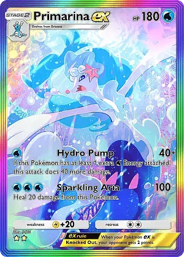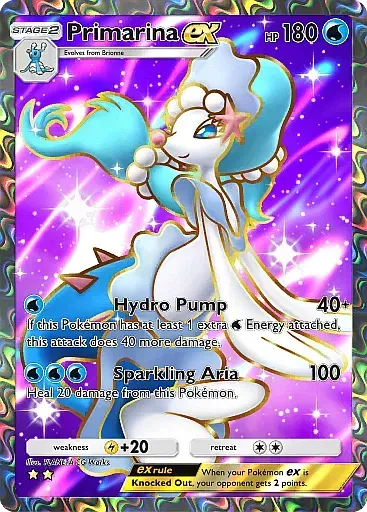 Primarina ex, również z Eevee Grove, jest potężnym atakującym z 180 HP, co pozwala mu przetrwać ataki, którym niewiele innych Pokémonów mogłoby sprostać. Jego atak „Sparkling Aria” leczy 20 obrażeń z Primariny ex za każdym razem, gdy jest używany, zwiększając jego trwałość. Atak „Hydro Pump” Primariny ex wymaga tylko jednej energii, co pozwala mu szybko zadawać obrażenia. Strategie oparte na Primarinie ex często polegają na szybkim wprowadzeniu jej do gry, co jest wspierane przez Sylveon ex i karty takie jak Rare Candy.