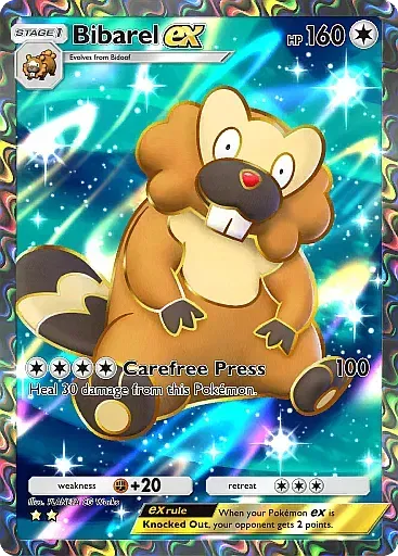 - Bibarel ex: Podobnie jak Tinkaton ex, Bibarel ex ma 160 HP i atak „Carefree Press”, który zadaje 100 obrażeń i leczy 30 HP. Jest to silny, bezbarwny atakujący, który może być używany w wielu typach talii, przypominając Venusaur ex.