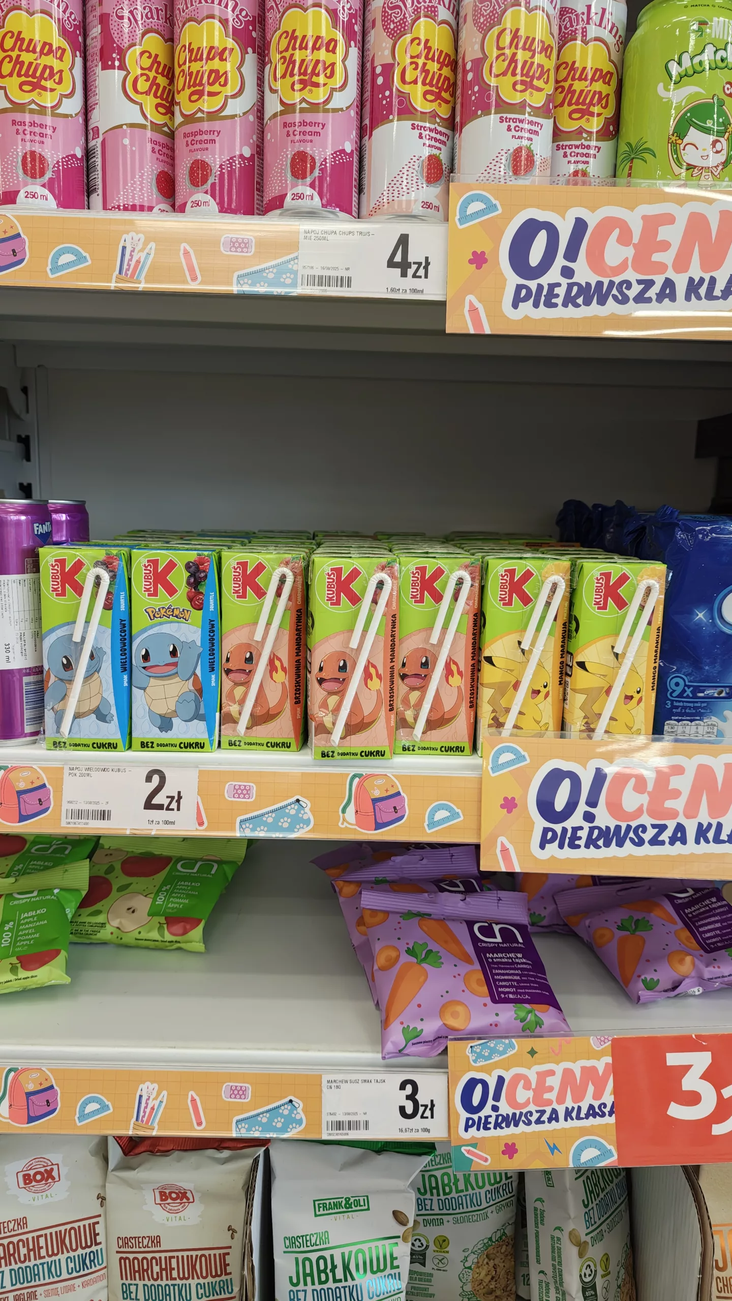 - Soczki Kubusiowe: Na półkach znalazłem również napoje Kubusiowe z wizerunkami Pokémonów, Pikachu, Squirtle’a i Charmandera. Kosztowały zaledwie 2 zł za sztukę.
