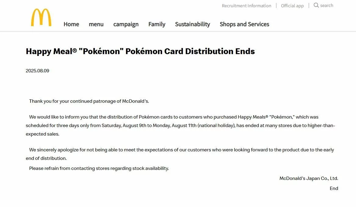 McDonald’s Japan ogłosiło promocję, w ramach której do zestawów Happy Meal dołączano specjalne karty Pokémon TCG. Zaledwie kilka godzin po rozpoczęciu akcji, w wielu restauracjach zabrakło zapasów. Prawie natychmiast po tym na japońskich platformach sprzedażowych pojawiły się zestawy z tymi kartami w cenach wielokrotnie przewyższających koszt Happy Meal. Media donosiły o ogromnych kolejkach i panice wśród klientów. Zdarzały się też doniesienia o kradzieżach, co tylko pogłębiało chaos.