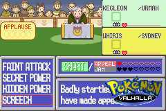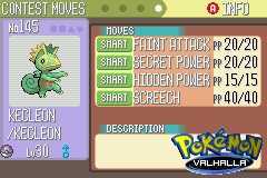 To jest Kecleon którego wyhodowałem specjalnie na konkurs.Ma same ataki typu Smart (sprytne).Te ataki jak zauważyć można nie są specjalnie ciekawą mieszanką.Jeśli nie zależy ci ogólnie na osiągnięciu championatu we wszystkich kategoriach wystarczy zatroszczyć się o jeden typ ataków.I po zbobyciu rangi mistrzowskiej zostawić je. Jeśli chcesz mieć mistrza w wielu kategoriach musisz zmieniać mu ataki (proponuję udać się do Move Tutora) i dawać mu rożne słodycze i nie tylko z jednego typu. A co to PokeSłodycze?