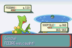 Jedynym sposobem na jego złapanie jest łowienie na Route 119. Ale jest małe utrudnienie (raczej duże). Złap go możecie tylko na 6 polach i tylko na nich. Mówiąc pole mam na myśli malutką krateczke. A przez Route 119 płynie ogromna rzeka. Kilka miejsc jest niedostępnych. Mozna jednak zmienić występowanie Feebasa w mieście Dewford na wyspie.