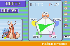 A i jeszcze coś...kiedy już Feebas będzie miał PEŁNY poziom piękności musisz iść w trawę (lub użyć Rare Candy) by zdobyć nim przynajmniej 1 level. Wtedy powinien wyskoczyć Milotic ale trzeba pamiętac ze poziom piękności musi być pełny.