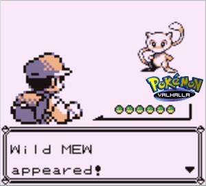 Aby złapać Mewa potrzeba trzech pierwszych odznak, oraz pokemona znającego Fly. W trakcie gry nie walcz z Gamblerem na Route 8, oraz z Youngsterem na Drodze 25 (po drodze do Billa). Graj normalnie, a gdy dojdziesz do Route 8 (pomiędzy Lavender a Saffaron), stań przed drzwiami do Underground Path. Teraz zrób Sava (od tej pory nie możesz używać tej opcji, bo się nie uda). Potem zrób krok do przodu i szybko wciśnij Start. Jeśli ci się uda, wyskoczy Menu, a Gambler będzie stał na przeciwko ciebie, lecz do ciebie nie podejdzie, (jeśli jednak podejdzie, to zresetuj grę i znów zacznij od sava). Jeśli się uda, to wybierz opcję "Pokemon" w Menu, użyj pokemona który zna Fly i poleć do Cerulean City (w momencie, w którym polecisz, Gambler cię zobaczy - pojawi się charakterystyczny dymek z "!" nad jego głową, a potem twój Pokemon poleci). Od teraz przcisk Start nie będzie reagował. Gdy dolecisz do Cerulean idź na północ, przejdź Nugget Bridge i znajdź Youngstera ze Slowpokiem. Rozpocznij z nim walkę (ważne jest to, by do ciebie podszedł) i pokonaj go. Potem poleć do Lavender i idź na zachód na Drogę 8. W tym momencie , w którym na nią wejdziesz, powinno się samo pojawić Menu. Wteny naciśnij przycisk "B", a pojawi się Mew na 7 levelu! UWAGA: jeśli wykonasz ten trik w inny sposób (np. zamiast Youngstera będziesz walczył z kimś innym, albo będziesz miał 5 ondznak), to zamiast Mewa pojawi się jakiś inny pokemon! Poniżej fotki potwierdzajšce ten fakt:
