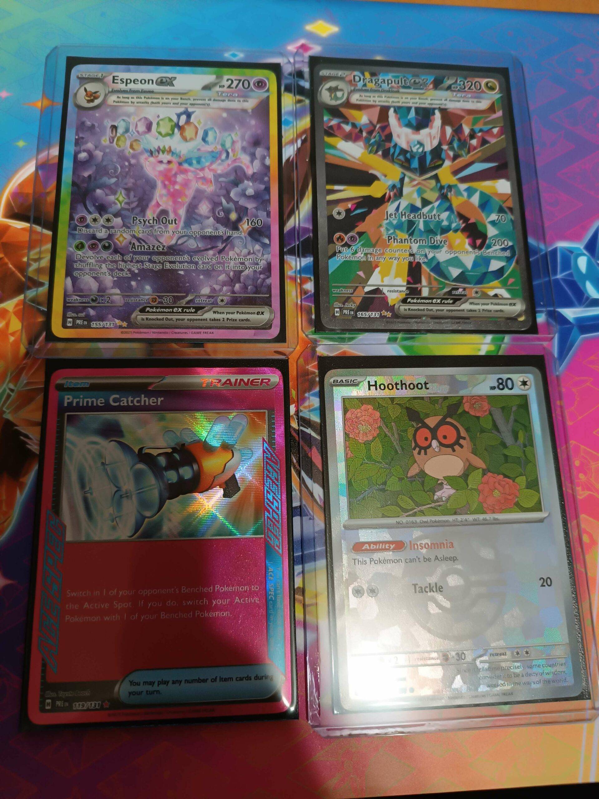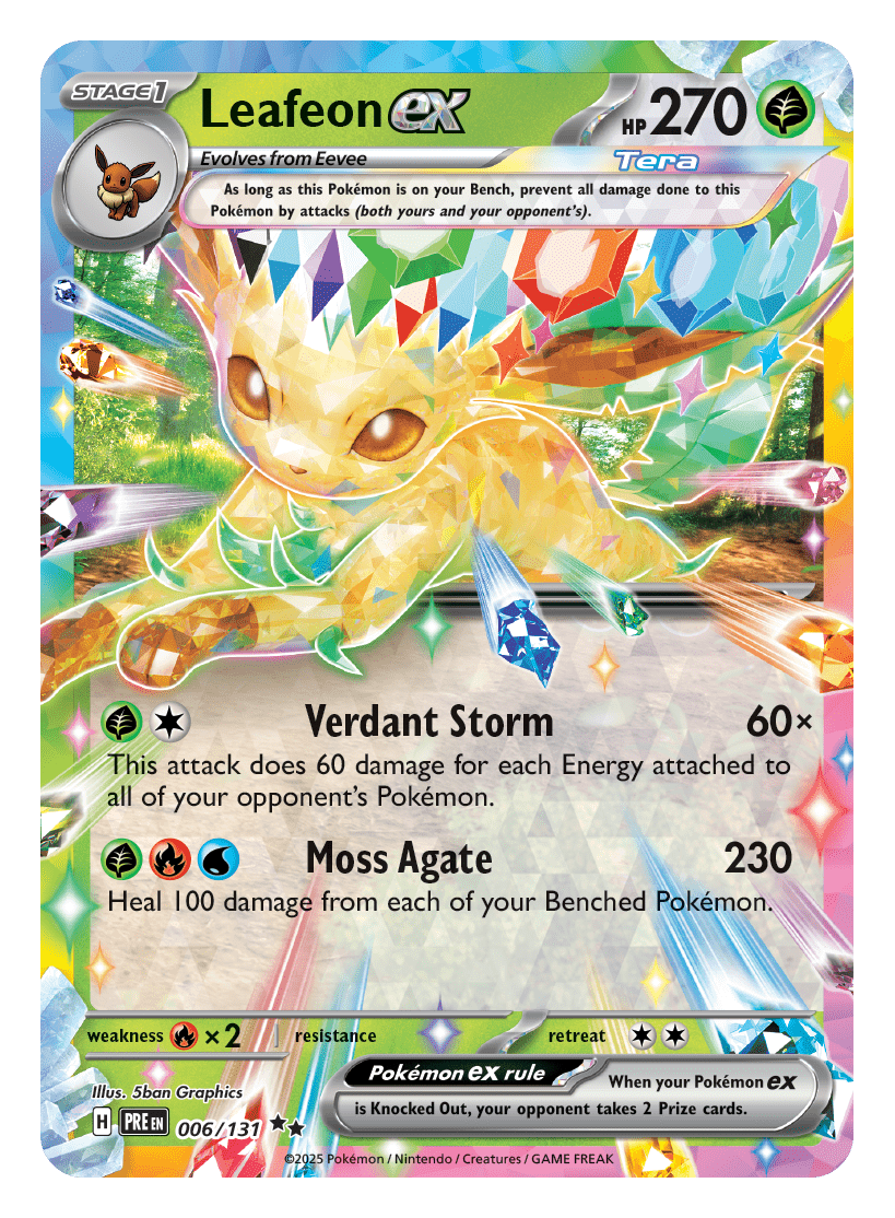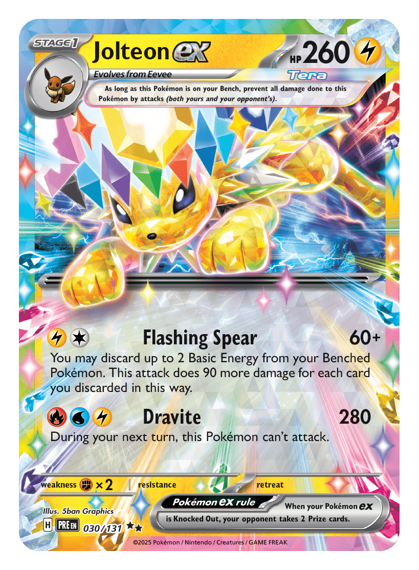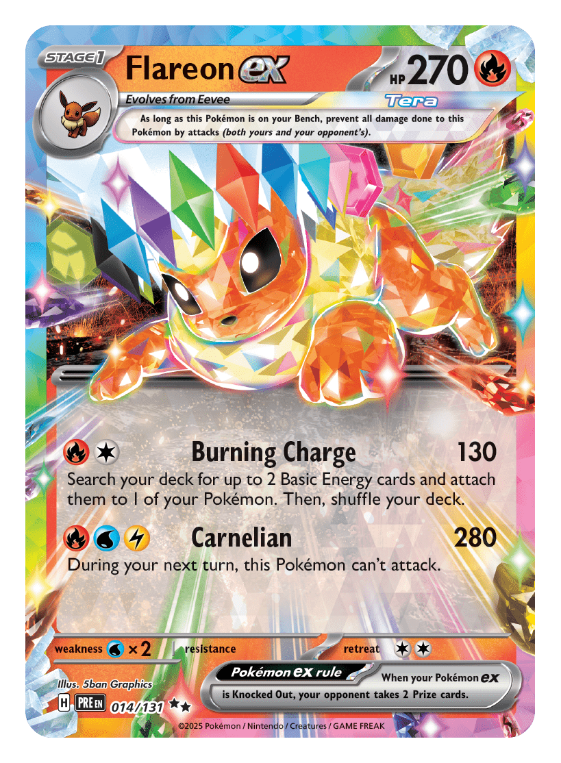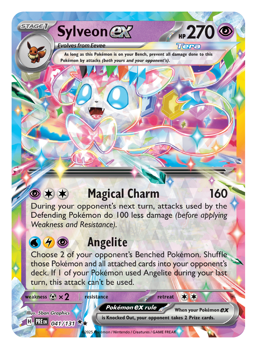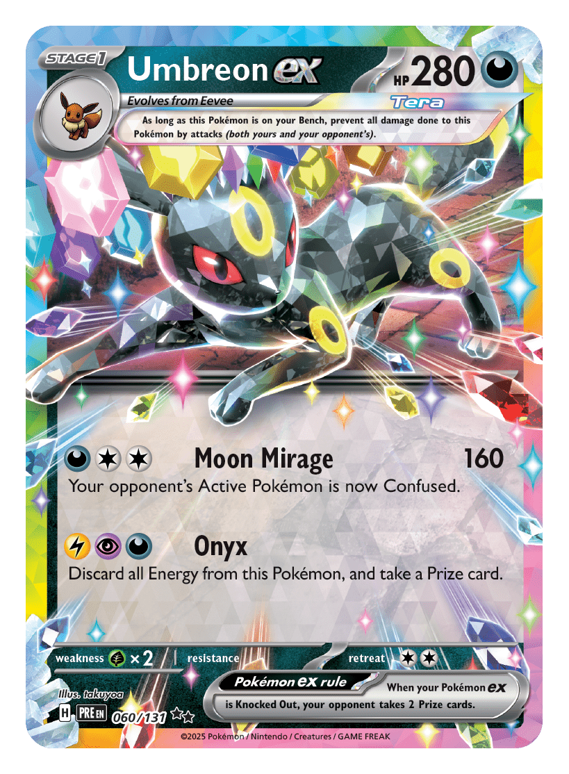- Scarlet & Violet—Prismatic Evolutions Binder Collection: zawiera pięć pakietów rozszerzonych Scarlet & Violet—Prismatic Evolutions i jeden album z dziewięcioma kieszeniami, który może pomieścić do 378 kart Pokémon TCG.