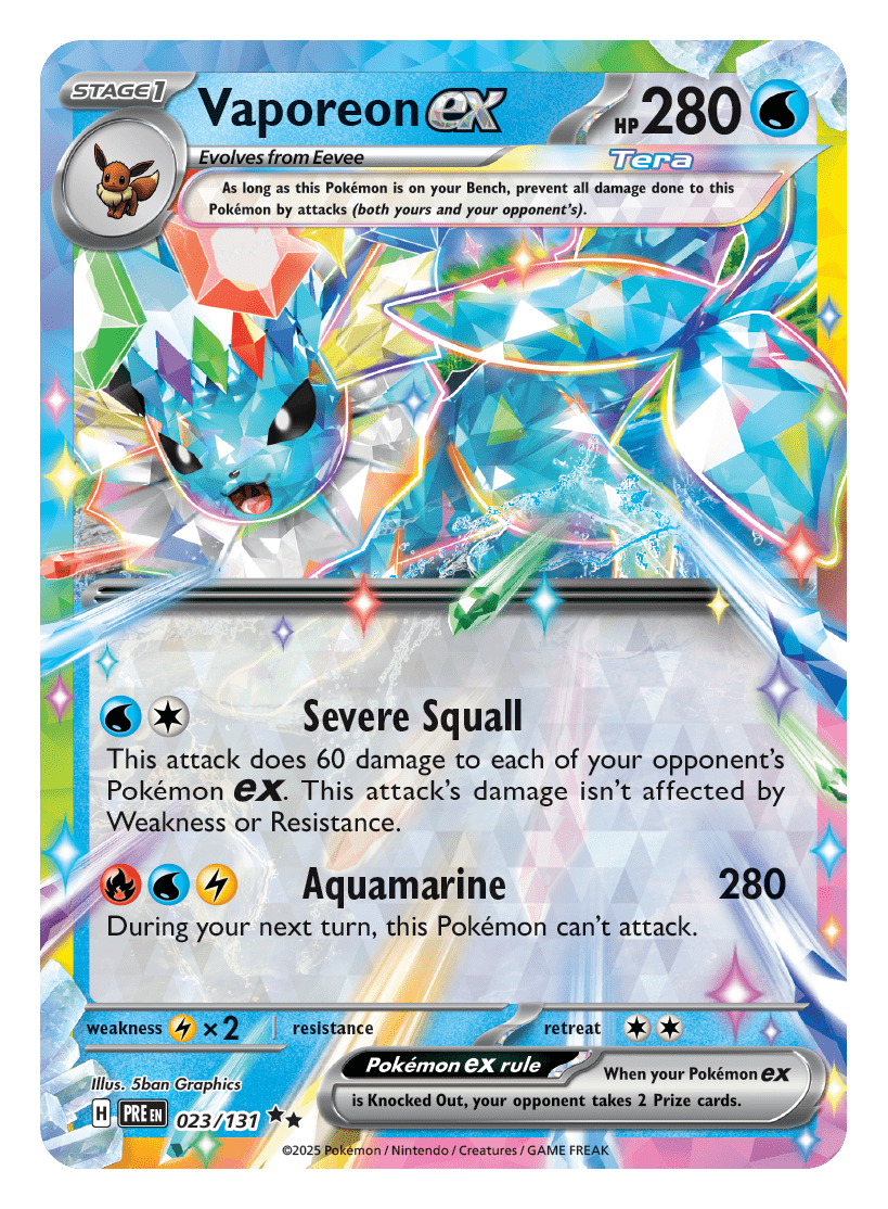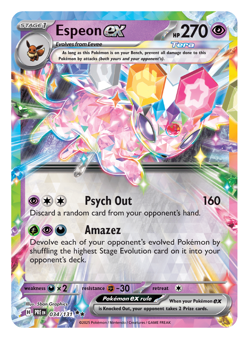 - Scarlet & Violet—Prismatic Evolutions Surprise Box dostępny od 7 lutego 2025 r.): zawiera cztery pakiety rozszerzone Scarlet & Violet—Prismatic Evolutions, jedno stylowe pudełko do przechowywania z czterema przegródkami i jedną losową, wytrawioną kartę promocyjną przedstawiającą Eevee lub jedną z jego ewolucji jako Pokémona ex Stellar Tera.