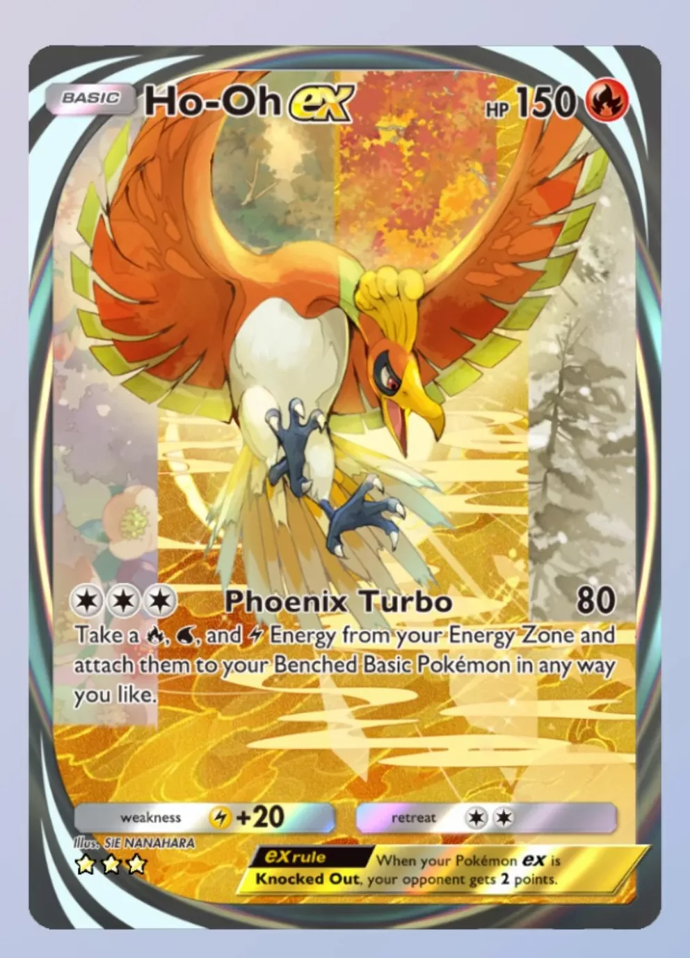 - Ho-Oh ex: Pierwotna wersja tej karty, z którą wiązały się największe kontrowersje, została zastąpiona. Nowa ilustracja przedstawia Ho-Oh w bardziej klasycznej, statycznej pozie, zbliżonej do tej, którą znamy z tradycyjnych kart. Użytkownicy zwracają uwagę, że pierwotna animacja Ho-Oh przedstawiała go w bardziej dynamicznej scenie, podczas gdy nowa grafika ma bardziej klasyczny, prosty charakter, choć zachowuje efekt „immersyjny”. Niektórzy zwracają uwagę, że nowa animacja jest mniej imponująca niż pierwotna wersja.